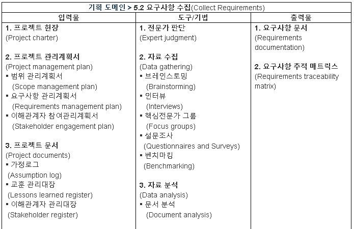 요구사항 수집은 프로젝트의 목표를 충족하기 위해 반드시 수행해야 할 작업을 식별하는 과정입니다.